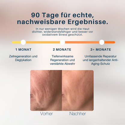 Perfekt für: Reduzierung stiller Entzündungen, Unterstützung einer Entgiftung nach den Feiertagen, tiefgehende Reparatur, Vorbeugung von Hautalterung, Bekämpfung von Glykation, Wiederherstellung einer klareren Haut nach dem Sommer oder oxidativem Stress, Energieschub, Verbesserung der Regeneration und Einleitung einer echten Zellregeneration.