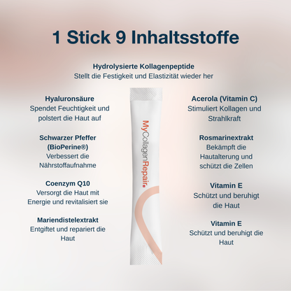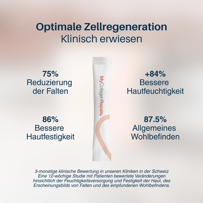 Die Formel MyCollagenRepair besteht aus 9 synergistisch wirkenden Wirkstoffen und unterstützt die biologischen Mechanismen, die an der Zellreparatur und der biologischen Alterung beteiligt sind.