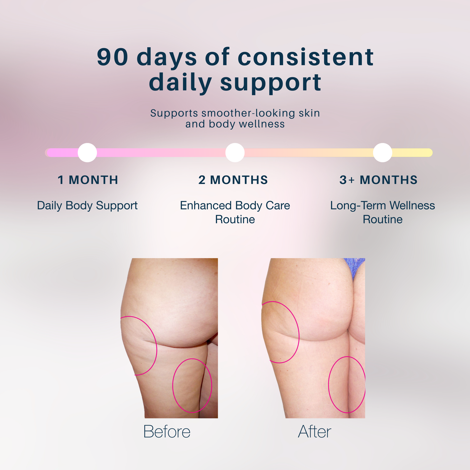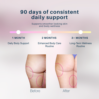 All photos below are unretouched and unfiltered and were taken after at least 90 days. Visible improvements in cellulite, firmness, and skin texture are a testament to the long-lasting, real-world effectiveness of the ingredients.