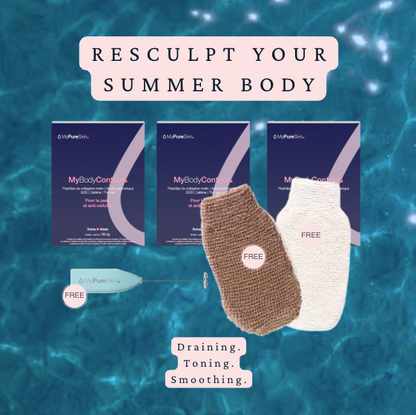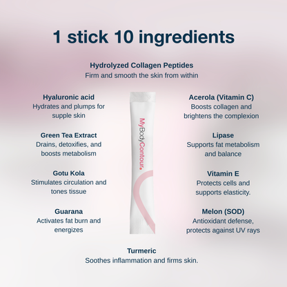 Composed of 10 active ingredients that work in synergy, the MyBodyContour formula supports the biological mechanisms involved in drainage, circulation, and tissue metabolic balance.
