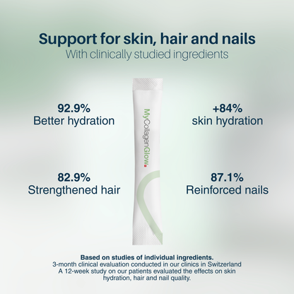 Composed of 11 active ingredients working in synergy, the MyCollagenGlow formula supports the biological mechanisms involved in functional hydration, balancing the skin and scalp microbiome, and preserving and strengthening nail integrity.