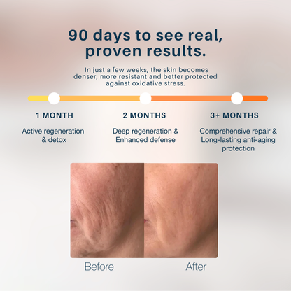 Our advanced formula tackles the six fundamental factors responsible for cellular damage, strengthening the body's natural repair mechanisms and promoting optimal regeneration of the skin, joints and tissues from within.