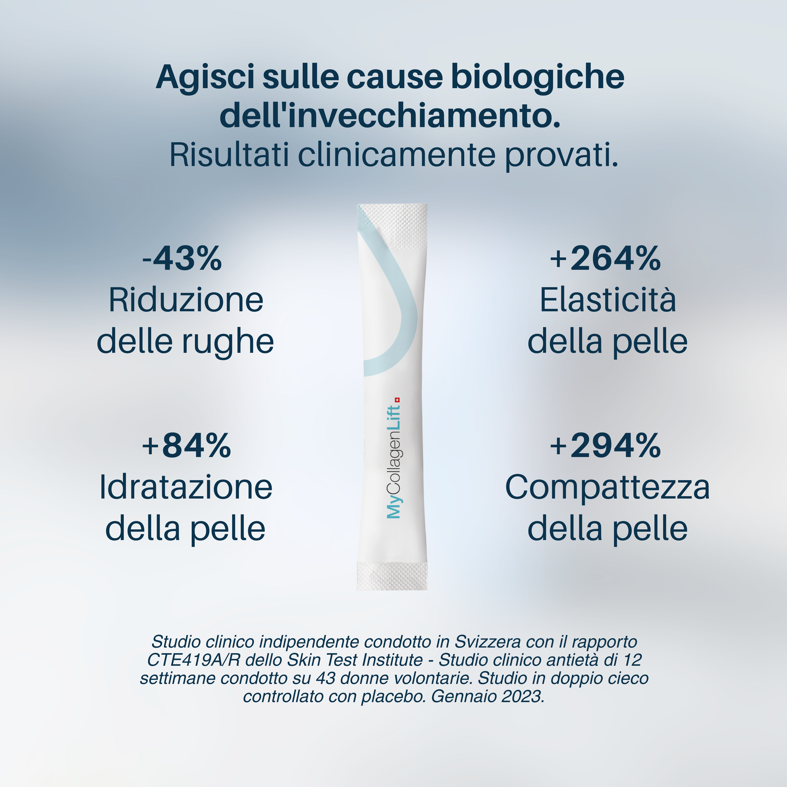 Rapporto Skin Test Institute CTE419A/R -- Studio clinico anti-età di 12 settimane condotto su 43 donne volontarie. Studio in doppio cieco contro placebo, valutando i seguenti benefici: idratazione, compattezza, elasticità, rughe, luminosità e altri parametri legati alle condizioni della pelle. Gen. 2023.