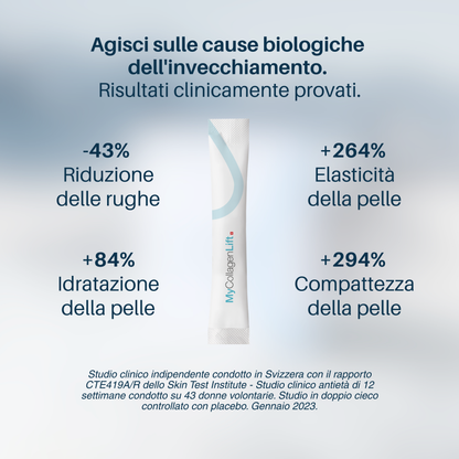 Francamente, non riesco più a contare tutte le creme e i sieri che ho provato negli ultimi anni. Ogni volta avevo l'impressione che funzionassero... ma in realtà era solo un'illusione. La mia pelle diventava sempre più sottile, spenta e le rughe si accentuavano nonostante tutti i miei sforzi. Cosa mancava a tutti questi prodotti? Un'azione davvero profonda. È stato allora che ho scoperto MyCollagenLift di MyPureSkin. Onestamente, all'inizio ero scettica: un altro integratore miracoloso? Eppure, tutto è cambiato. Prendo una bustina ogni mattina a digiuno in un bicchiere d'acqua e in poche settimane la mia pelle ha iniziato a trasformarsi. Più tonica, più compatta, molto più idratata. Anche i miei amici mi hanno fatto i complimenti senza sapere che stavo seguendo una cura. Quello che mi è piaciuto di più è che i risultati sono naturali: non ho bisogno di trucco o filtri per avere un aspetto sano. E, soprattutto, sento che la mia pelle è più forte dall'interno. Ciò che mi ha convinta definitivamente è stato lo studio clinico svizzero condotto sul prodotto stesso. E non si tratta di promesse di marketing: sono risultati scientificamente misurati, qui in Svizzera, su donne reali. La formula è estremamente completa, con 9 principi attivi naturali ultra concentrati: collagene marino, acido ialuronico, ceramidi, silicio, vitamina C naturale... tutto ciò che serve per nutrire la pelle dall'interno. E ciliegina sulla torta: è 100% Swiss Made, senza OGM, senza glutine, senza conservanti. Oggi, dopo 3 mesi di cura, posso davvero dire di essere ringiovanita. La mia carnagione è luminosa, i miei lineamenti sono più levigati, le mie rughe attenuate. E anche le mie articolazioni stanno meglio! Non pensavo che fosse possibile solo con un integratore.