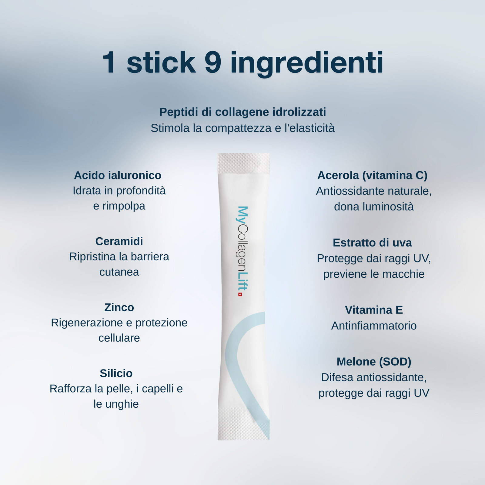 Composta da 9 ingredienti che agiscono in sinergia, la formula MyCollagenLift contribuisce a preservare la struttura e la densità della pelle.